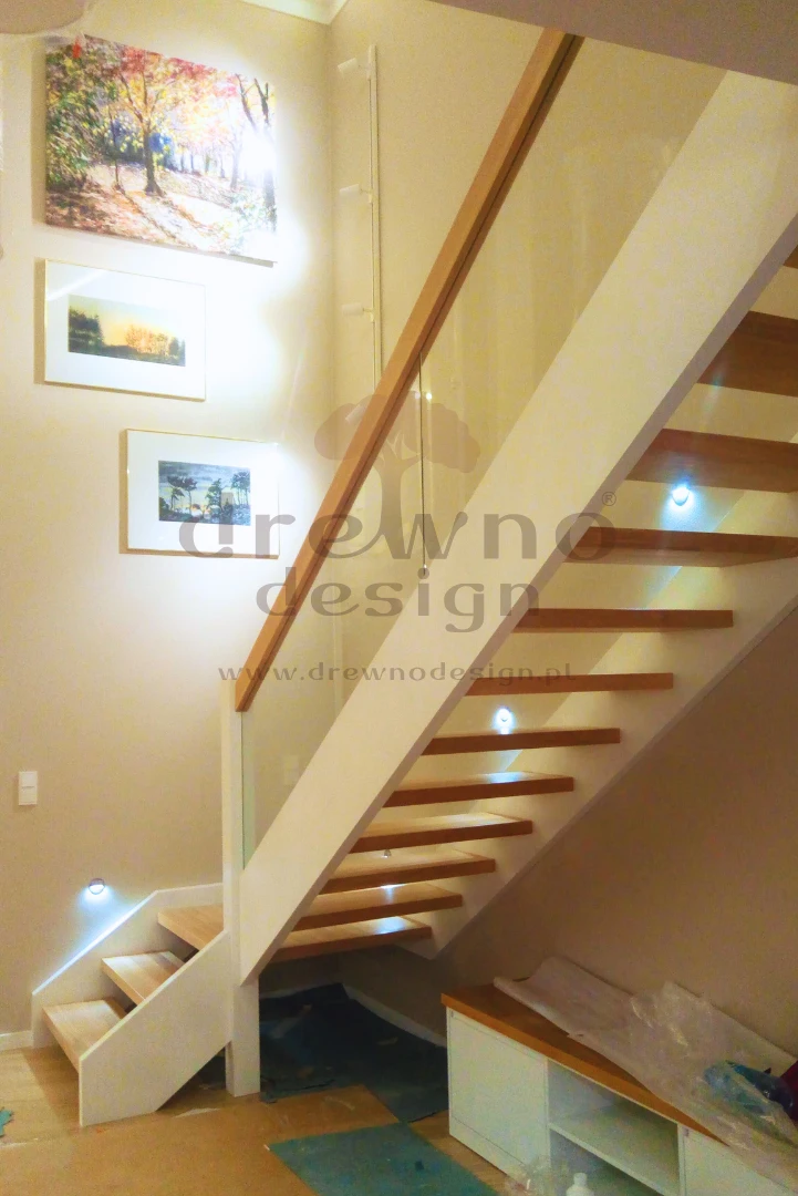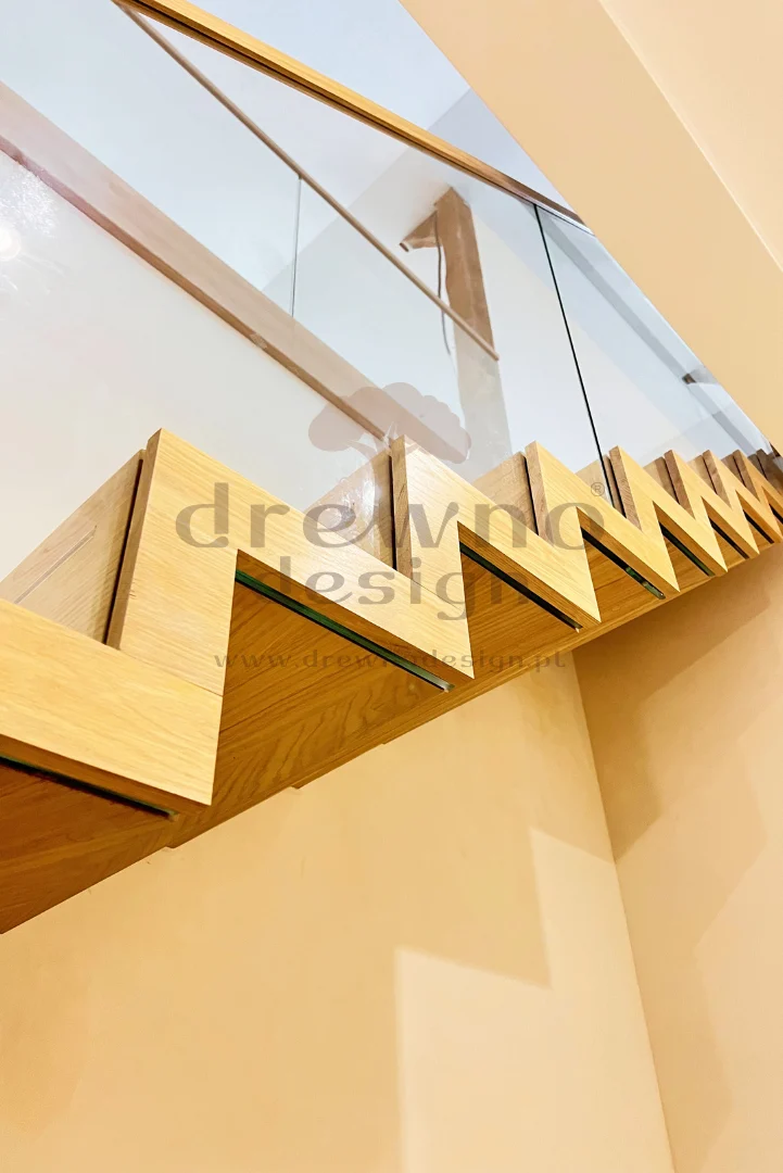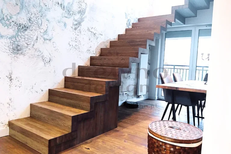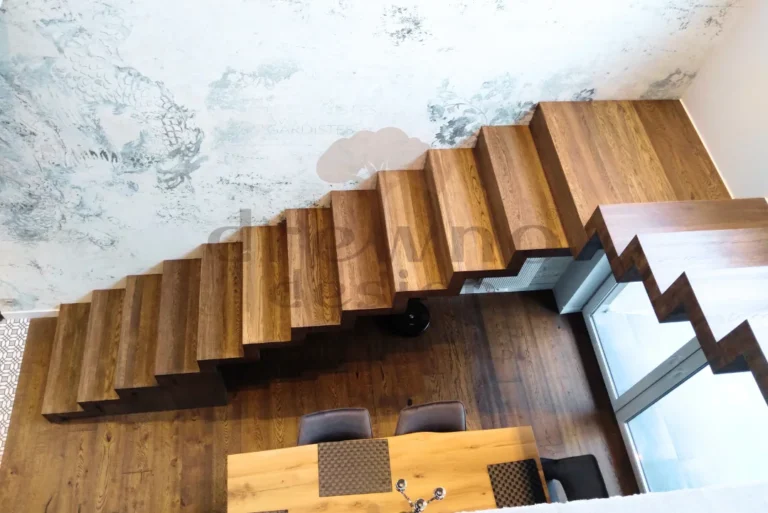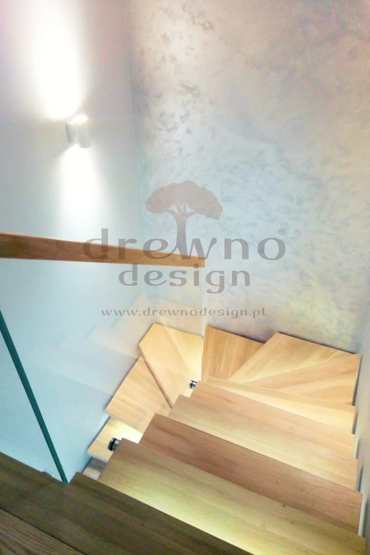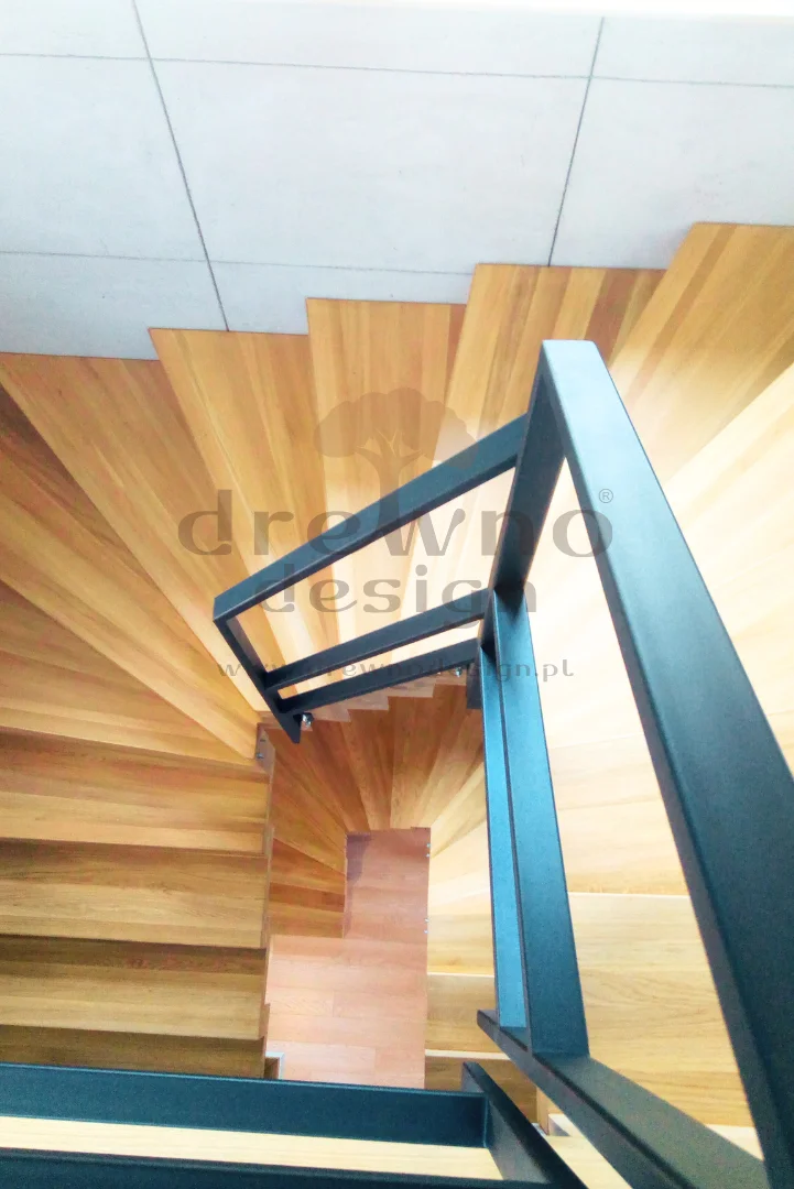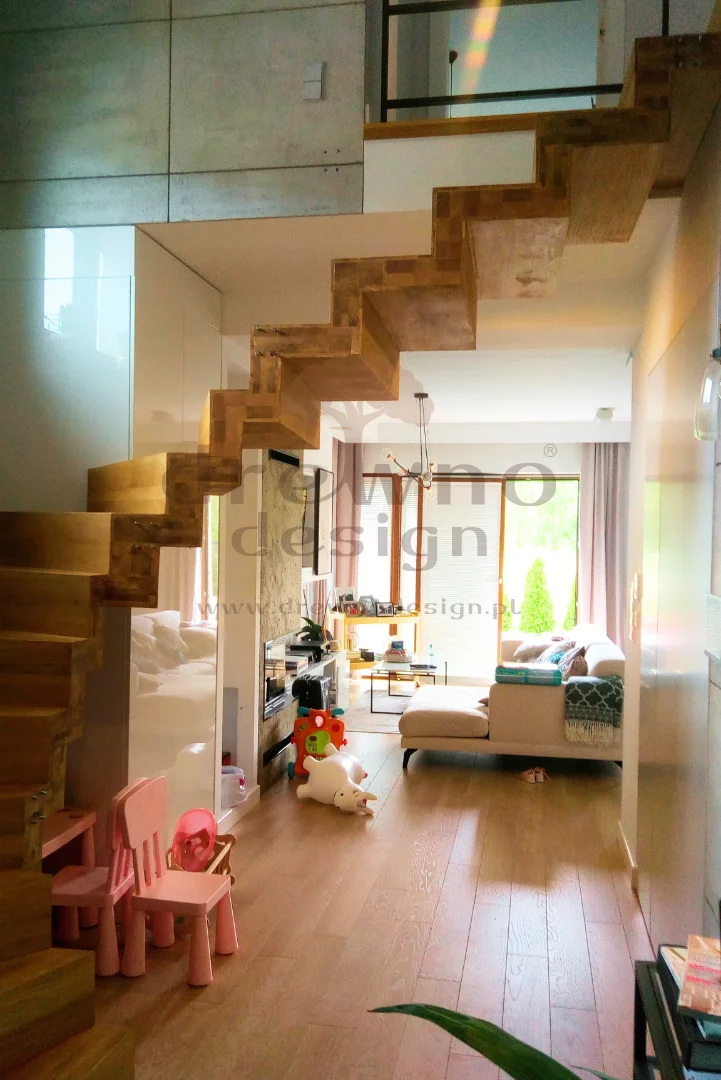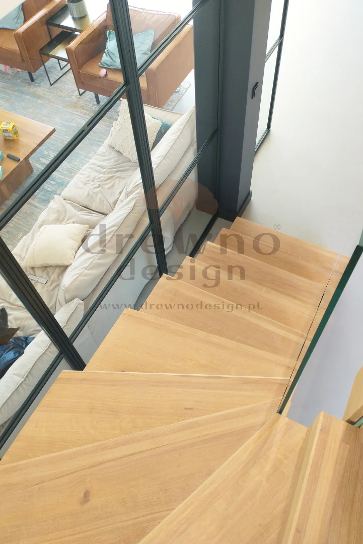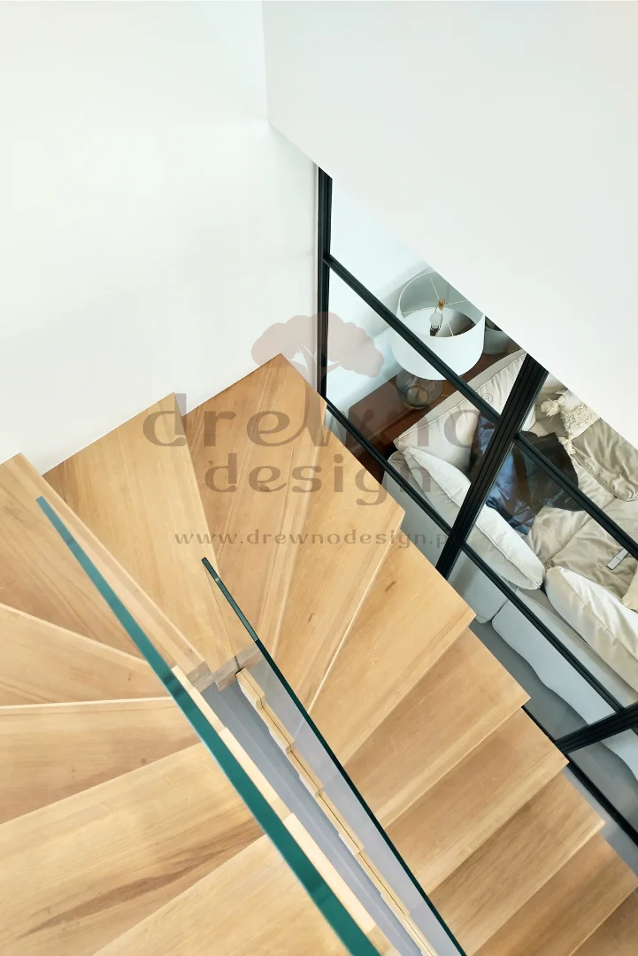 Dzięki zastosowaniu specjalnych stopni oraz solidnej, wspornikowej konstrukcji, schody te „unoszą się” samodzielnie, co pozwala na uzyskanie lekkiego, przestrzennego wyglądu.